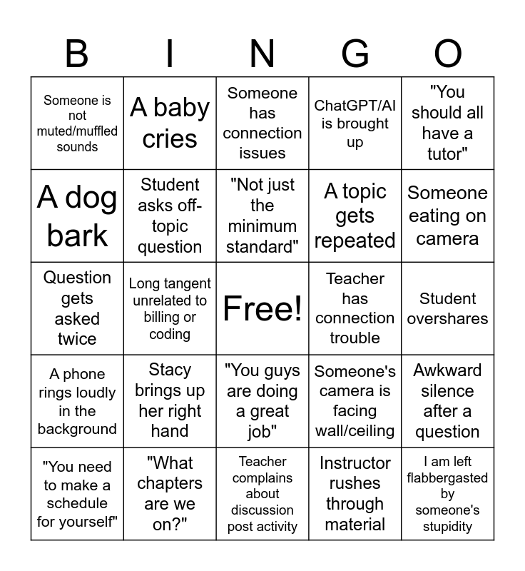 This bingo card has a free space and 24 words: Stacy brings up her right hand, "What chapters are we on?", "Not just the minimum standard", "You need to make a schedule for yourself", "You should all have a tutor", Someone is not muted/muffled sounds, A dog bark, A baby cries, Teacher has connection trouble, "You guys are doing a great job", A topic gets repeated, Question gets asked twice, Someone's camera is facing wall/ceiling, Awkward silence after a question, Student asks off-topic question, Instructor rushes through material, Student overshares, Someone has connection issues, Someone eating on camera, Long tangent unrelated to billing or coding, I am left flabbergasted by someone's stupidity, A phone rings loudly in the background, ChatGPT/AI is brought up and Teacher complains about discussion post activity.