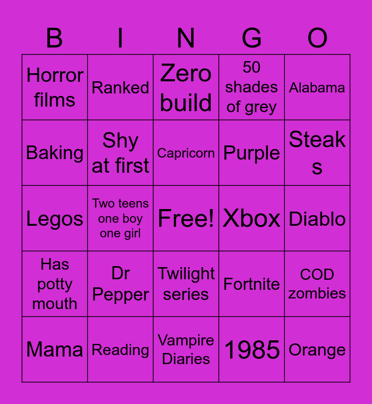 This bingo card has a free space and 24 words: Mama, Dr Pepper, Capricorn, 1985, Alabama, Horror films, Ranked, Zero build, Xbox, Diablo, Legos, Shy at first, Fortnite, COD zombies, Baking, Reading, Vampire Diaries, 50 shades of grey, Steak s, Has potty mouth, Two teens one boy one girl, Twilight series, Purple and Orange.