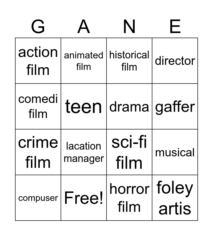 This bingo card has 22 words: Free!, adventure film, animated film, producer, teen, drama, action film, historical film, sci-fi film, foley artis, crime film, director, fantasy film, camera operator, horror film, sound recordist, musical, compuser, lacation manager, comedi film, gaffer and thriller.