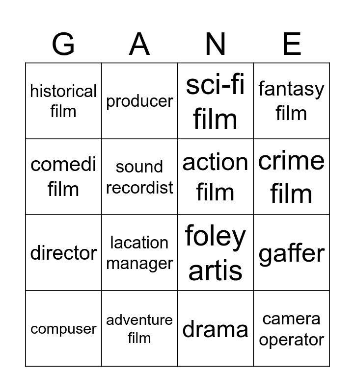 This bingo card has 21 words: adventure film, animated film, producer, teen, drama, action film, historical film, sci-fi film, foley artis, crime film, director, fantasy film, camera operator, horror film, sound recordist, musical, compuser, lacation manager, comedi film, gaffer and thriller.