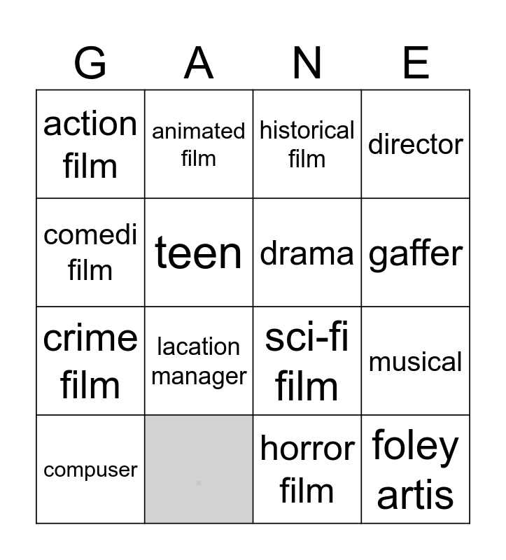 This bingo card has 22 words: ., adventure film, animated film, producer, teen, drama, action film, historical film, sci-fi film, foley artis, crime film, director, fantasy film, camera operator, horror film, sound recordist, musical, compuser, lacation manager, comedi film, gaffer and thriller.