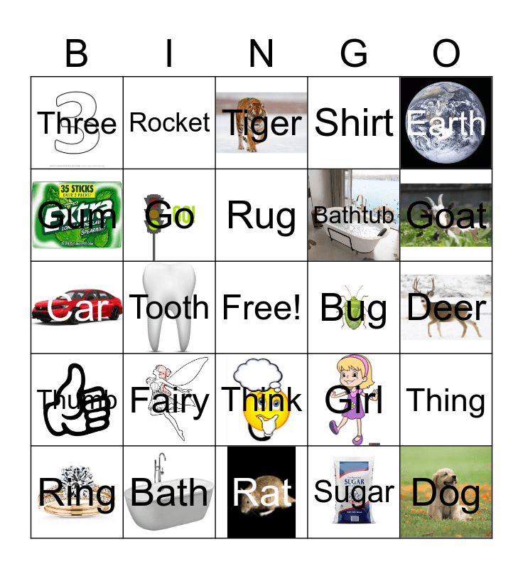This bingo card has 24 images, a free space and 29 words: Ring, Bird, Tooth, Pear, Three, Tiger, Go, Fairy, Bug, Bath, Deer, Dog, Rat, Sugar, Goat, Horse, Think, Thumb, Earth, Car, Girl, Toothpaste, Bathtub, Gum, Shirt, Rocket, Thing, Rug and Ghost.