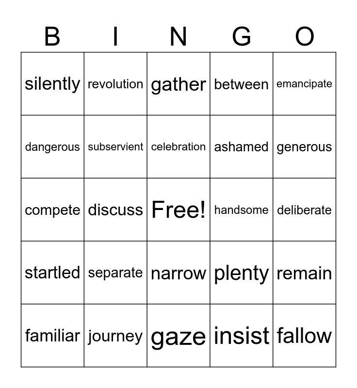 This bingo card has a free space and 24 words: separate, journey, celebration, familiar, emancipate, silently, dangerous, revolution, handsome, narrow, ashamed, compete, plenty, remain, subservient, insist, deliberate, gather, generous, discuss, fallow, startled, between and gaze.