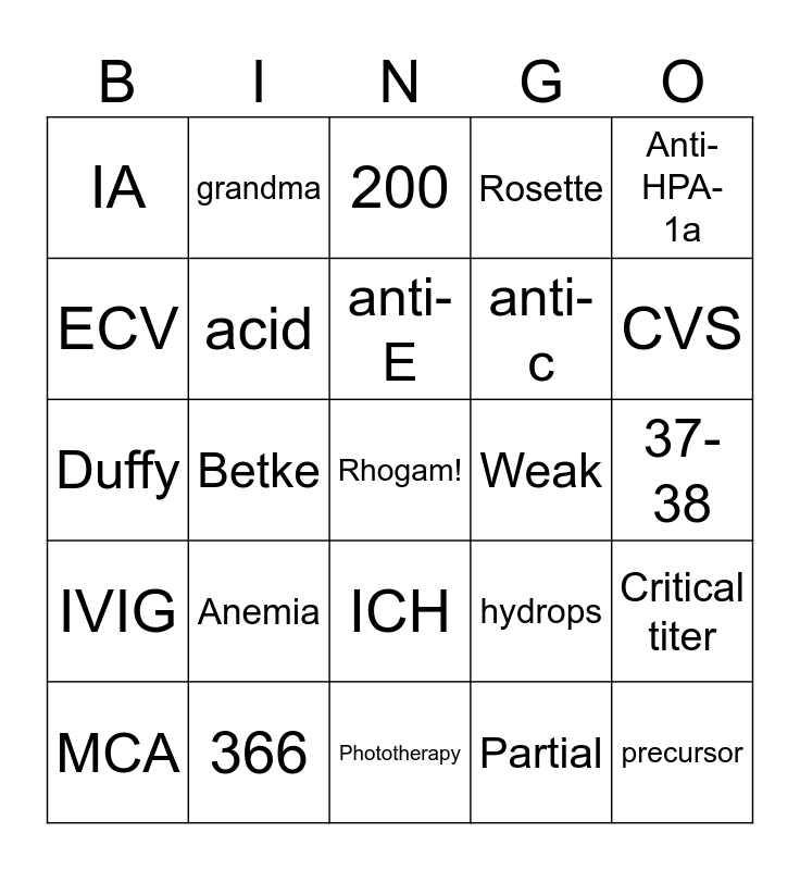 This bingo card has a free space and 27 words: hydrops, transfusion, anti-c, Phototherapy, ECV, 200, grandma, IVIG, Weak, Critical titer, Duffy, Rosette, MCA, 366, CVS, malaria, acid, anti-E, Anemia, IA, 37-38, Partial, Betke, precursor, ICH, Anti-HPA-1a and Miso.