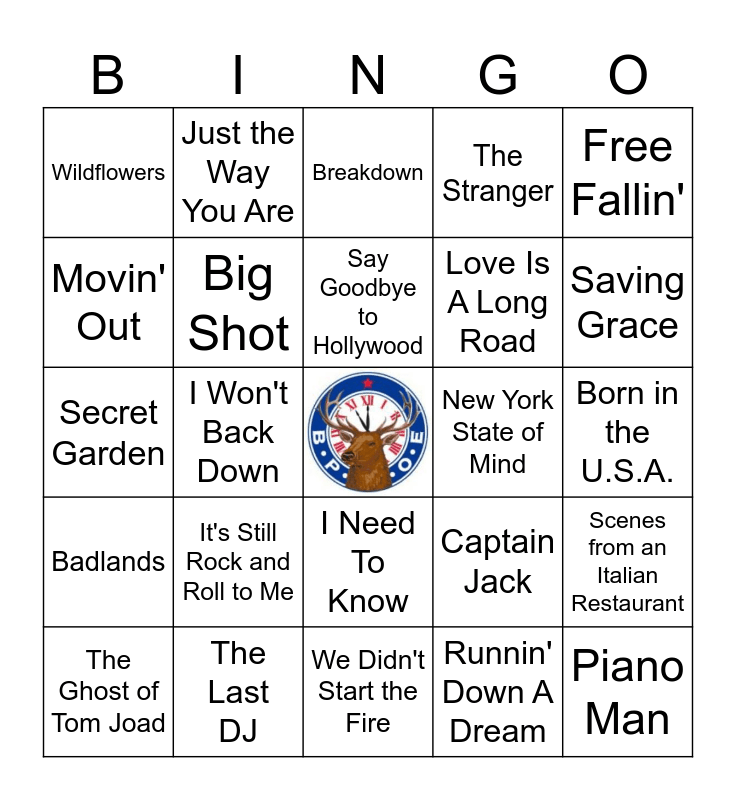 This bingo card has a free space and 50 words: Uptown Girl, Piano Man, She's Always a Woman, We Didn't Start the Fire, It's Still Rock and Roll to Me, My Life, Just the Way You Are, Only the Good Die Young, Movin' Out, You May Be Right, Big Shot, The Stranger, Scenes from an Italian Restaurant, Captain Jack, She's Got a Way, The Entertainer, Say Goodbye to Hollywood, New York State of Mind, You Don't Know How It Feels, Free Fallin', I Won't Back Down, Runnin' Down A Dream, Wildflowers, Love Is A Long Road, You Wreck Me, It's Good To Be King, Saving Grace, American Girl, Breakdown, I Need To Know, Refugee, Learning To Fly, Mary Jane's Last Dance, Here Comes My Girl, The Last DJ, Walls - Circus, Dancing In the Dark, I'm On Fire, Streets of Philadelphia, Born in the U.S.A., Hungry Heart, Born to Run, Glory Days, Streets of Philadelphia, The Ghost of Tom Joad, Secret Garden, The Rising, Tenth Avenue Freeze-Out, Badlands and Rosalita.