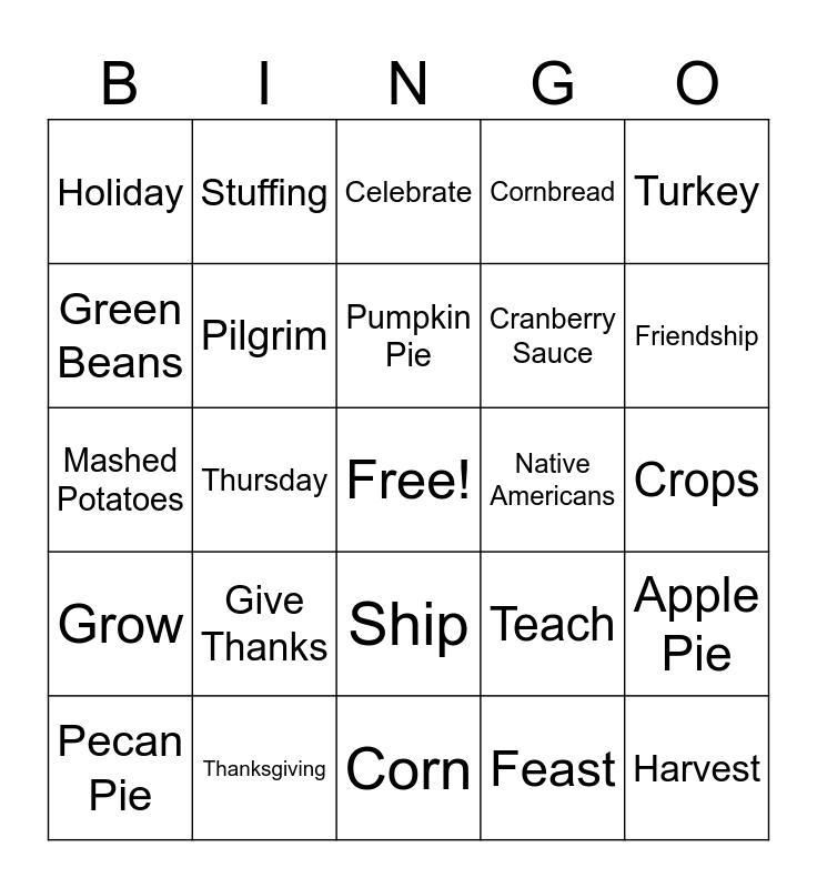 This bingo card has a free space and 30 words: Thanksgiving, November, Thursday, Autumn, Holiday, Celebrate, Pilgrim, Ship, Native Americans, Corn, Crops, Harvest, Feast, Peace, Friendship, Help, Teach, Grow, Give Thanks, Turkey, Mashed Potatoes, Gravy, Stuffing, Cranberry Sauce, Green Beans, Cornbread, Apple Pie, Pecan Pie, Pumpkin Pie and Family.