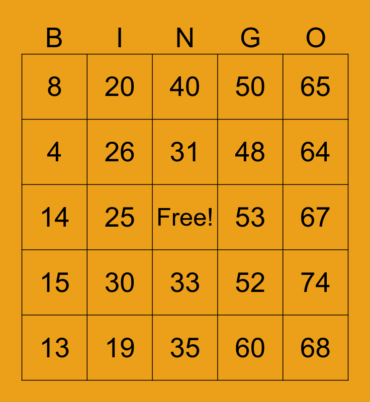 This bingo card has a free space and 75 words: 1, 16, 31, 46, 61, 2, 17, 32, 47, 62, 3, 18, 33, 48, 63, 4, 19, 34, 49, 64, 5, 20, 35, 50, 65, 6, 21, 36, 51, 66, 7, 22, 37, 52, 67, 8, 23, 38, 53, 68, 9, 24, 39, 54, 69, 10, 25, 40, 55, 70, 11, 26, 41, 56, 71, 12, 27, 42, 57, 72, 13, 28, 43, 58, 73, 14, 29, 44, 59, 74, 15, 30, 45, 60 and 75.