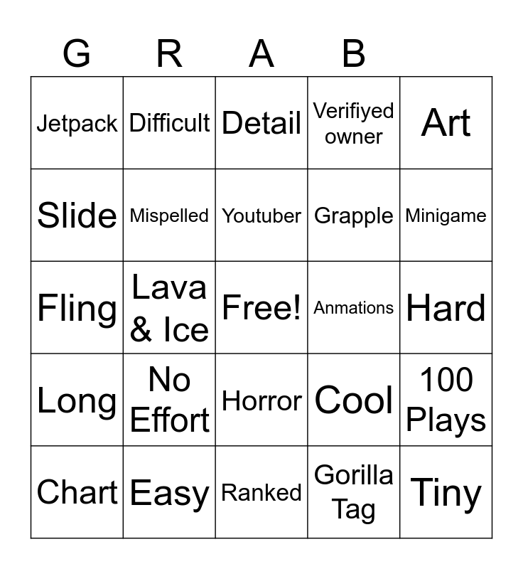 This bingo card has a free space and 24 words: No Effort, Easy, Youtuber, Chart, Art, Jetpack, Slide, Difficult, Anmations, Horror, Grapple, Fling, Cool, 100 Plays, Mispelled, Gorilla Tag, Hard, Detail, Minigame, Lava & Ice, Tiny, Long, Verifiyed owner and Ranked.