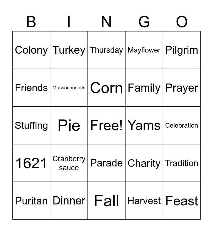 This bingo card has a free space and 34 words: Thanksgiving, Harvest, Holiday, Plymouth, 1621, Massachusetts, Pilgrim, Puritan, Turkey, Mashed potatoes, Corn, Thursday, Football, Gravy, Yams, Prayer, Dinner, Stuffing, Cranberry sauce, Charity, Parade, Pumpkin, Colony, Celebration, Fall, Feast, Mayflower, Thanks, Family, Friends, Leaf, Pie, Tradition and Apples.