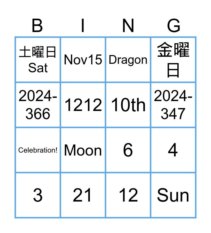 This bingo card has 2 images and 20 words: 4, 7, Dragon, Oct, 3, 2024-366, 21, 土曜日 Sat, Celebration!, Nov15, Moon, 6, 1212, Sun, 10th, 19, 2024-347, 金曜日, 12 and 8.
