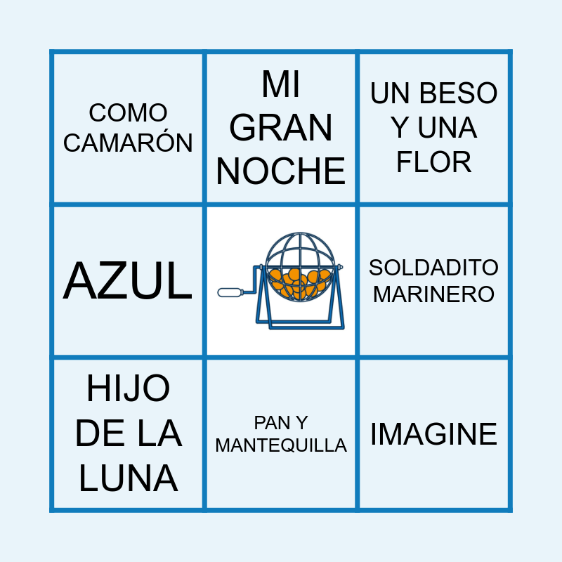 This bingo card has a free space and 8 words: SOLDADITO MARINERO, UN BESO Y UNA FLOR, MI GRAN NOCHE, HIJO DE LA LUNA, COMO CAMARÓN, IMAGINE, AZUL and PAN Y MANTEQUILLA.