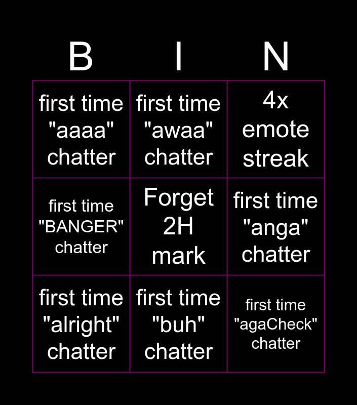 This bingo card has a free space and 8 words: first time "anga" chatter, 4x emote streak, first time "awaa" chatter, first time "alright" chatter, first time "aaaa" chatter, first time "agaCheck" chatter, first time "BANGER" chatter and first time "buh" chatter.