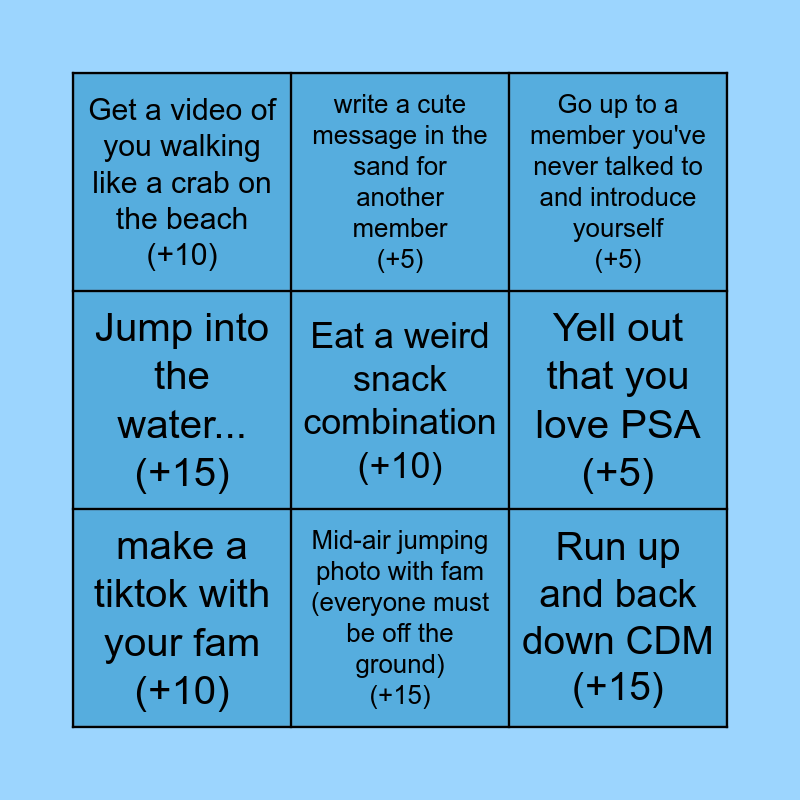 This bingo card has a free space and 8 words: Yell out that you love PSA (+5), Go up to a member you've never talked to and introduce yourself (+5), write a cute message in the sand for another member (+5), make a tiktok with your fam (+10), Get a video of you walking like a crab on the beach (+10), Run up and back down CDM (+15), Jump into the water... (+15) and Mid-air jumping photo with fam (everyone must be off the ground) (+15).