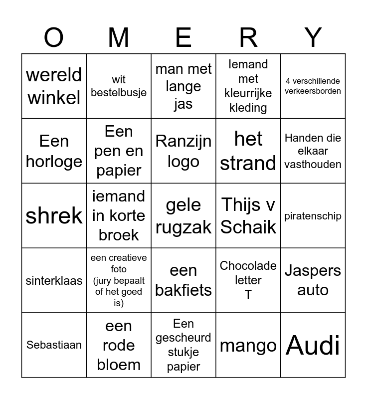 This bingo card has 25 words: sinterklaas, een rode bloem, gele rugzak, mango, 4 verschillende verkeersborden, wereld winkel, wit bestelbusje, man met lange jas, Thijs v Schaik, Jaspers auto, Een horloge, Een pen en papier, Een gescheurd stukje papier, Chocolade letter T, Handen die elkaar vasthouden, Sebastiaan, iemand in korte broek, Ranzijn logo, het strand, piratenschip, shrek, een creatieve foto (jury bepaalt of het goed is), een bakfiets, Iemand met kleurrijke kleding and Audi.