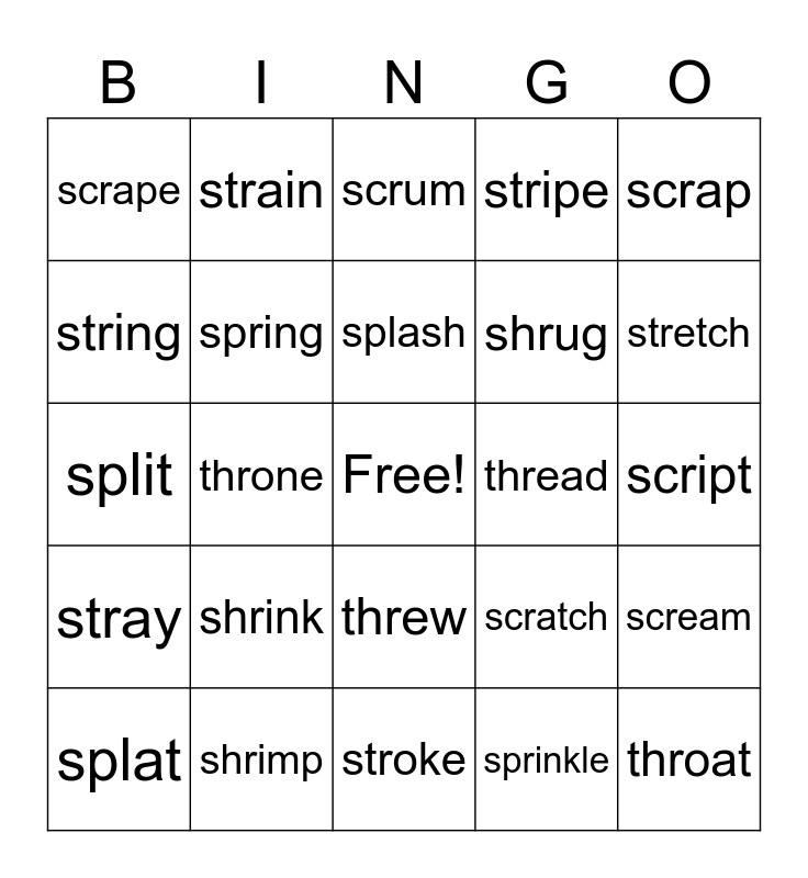 This bingo card has a free space and 24 words: shrink, shrimp, splash, splat, scrap, scrape, string, strain, thread, threw, shrug, split, scratch, scream, spring, sprinkle, script, scrum, stretch, throne, throat, stray, stripe and stroke.