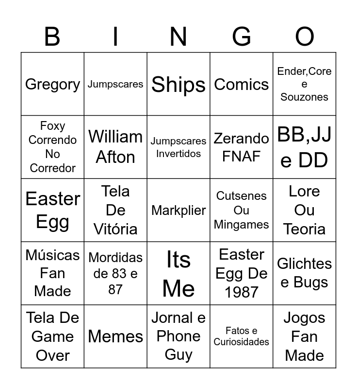 This bingo card has a free space and 24 words: Mordidas de 83 e 87, Memes, Jumpscares Invertidos, Tela De Game Over, Ender,Core e Souzones, Gregory, Foxy Correndo No Corredor, Jumpscares, Cutsenes Ou Mingames, Its Me, Zerando FNAF, Easter Egg, Easter Egg De 1987, Glichtes e Bugs, William Afton, Fatos e Curiosidades, Lore Ou Teoria, Ships, BB,JJ e DD, Tela De Vitória, Jogos Fan Made, Músicas Fan Made, Comics and Jornal e Phone Guy.