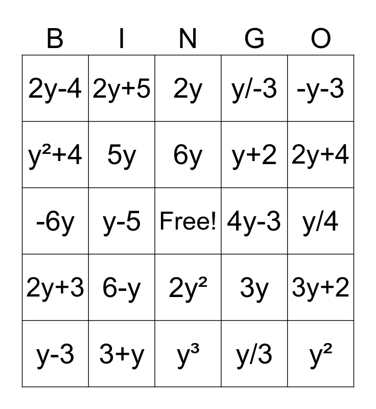 This bingo card has a free space and 26 words: 2y², y/3, 6y, 3+y, -y-3, 2y-4, y²+4, 2y+5, y/4, 3y, y+2, -6y, 3y+2, y-3, y-5, 2y+2, y/-3, 2y+3, 2y, y², 2y+4, y³, 4y-3, 6-y, 5y and y/2.