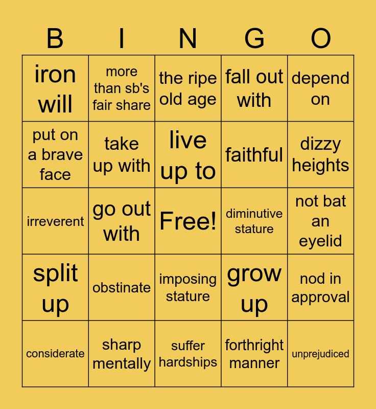 This bingo card has a free space and 36 words: look after, take after, put up with, take up with, grow up, split up, live up tо, look up to, depend on, get on, go out with, fall out with, conjure up memories, diminutive stature, dizzy heights, iron will, put sb's foot down, obstinate, unprejudiced, the ripe old age, not bat an eyelid, nod in approval, sharp mentally, considerate, suffer hardships, more than sb's fair share, irreverent, home-baked treats, faithful, put on a brave face, go on with it, unassuming manner, forthright manner, imposing stature, split second and lofty heights.
