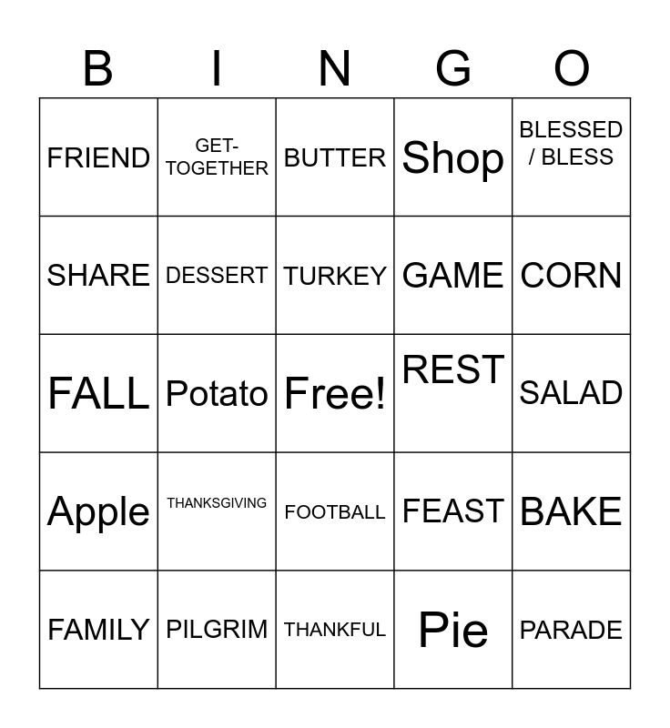 This bingo card has a free space and 25 words: THANKSGIVING, THANKFUL, TURKEY, FAMILY, BLESSED / BLESS, FRIEND, SHARE, GET-TOGETHER, REST, FOOTBALL, GAME, FALL, FEAST, BAKE, DESSERT, BREAD, SALAD, BUTTER, CORN, Potato, PARADE, PILGRIM, Apple, Shop and Pie.