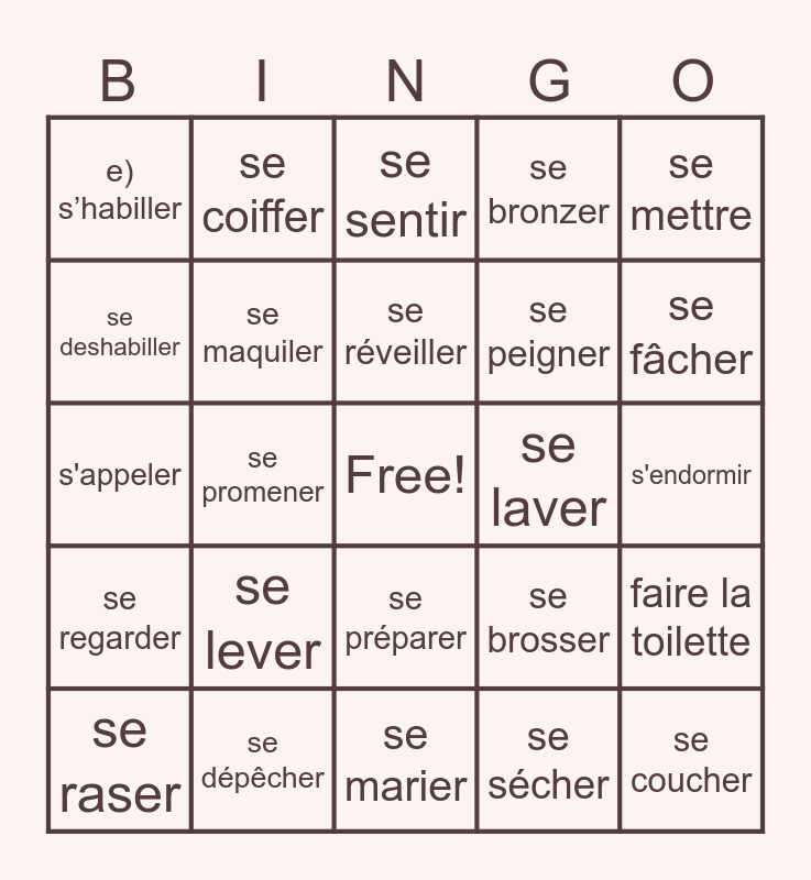 This bingo card has a free space and 24 words: se lever, se dépêcher, se réveiller, se raser, se mettre, e) s’habiller, se deshabiller, se coiffer, se laver, se préparer, se peigner, s'appeler, se brosser, faire la toilette, se maquiler, se sécher, s'endormir, se sentir, se fâcher, se promener, se coucher, se regarder, se bronzer and se marier.