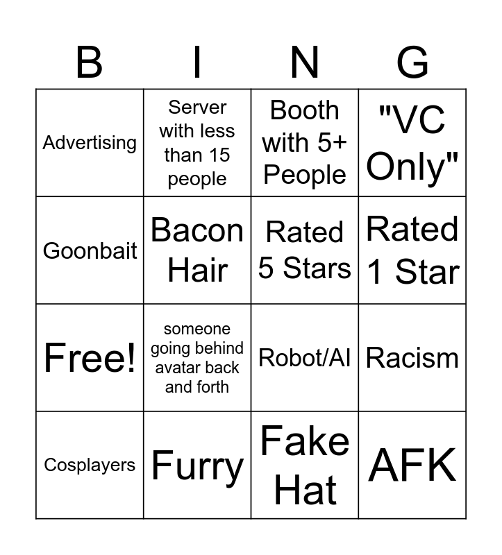 This bingo card has 20 words: Racism, Homophobic, Booth with 5+ People, Military Avatar, Cosplayers, Goonbait, Furry, Advertising, Free!, Server with less than 15 people, someone going behind avatar back and forth, Robot/AI, Bacon Hair, AFK, Rated 5 Stars, Random Argument, Rated 1 Star, "VC Only", Fake Hat and Massive Avatar.