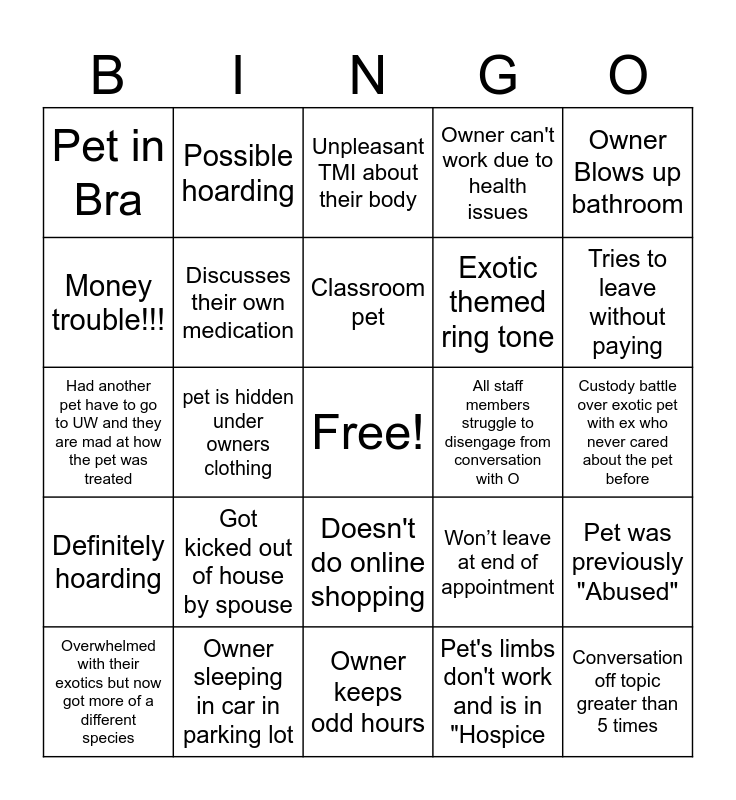 This bingo card has a free space and 24 words: Got kicked out of house by spouse, Owner sleeping in car in parking lot, Classroom pet, Overwhelmed with their exotics but now got more of a different species, Owner Blows up bathroom, Pet in Bra, Money trouble!!!, Possible hoarding, All staff members struggle to disengage from conversation with O, Doesn't do online shopping, Exotic themed ring tone, Had another pet have to go to UW and they are mad at how the pet was treated, Won’t leave at end of appointment, Pet was previously "Abused", Discusses their own medication, Pet's limbs don't work and is in "Hospice, Custody battle over exotic pet with ex who never cared about the pet before, Unpleasant TMI about their body, Tries to leave without paying, pet is hidden under owners clothing, Conversation off topic greater than 5 times, Definitely hoarding, Owner can't work due to health issues and Owner keeps odd hours.
