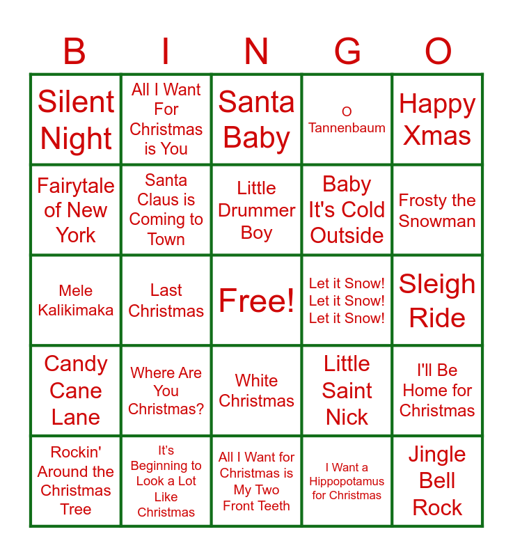 This bingo card has a free space and 29 words: Rockin' Around the Christmas Tree, It's the Most Wonderful Time of the Year, Last Christmas, Grandma Got Run Over By a Reindeer, Silent Night, Santa Baby, Santa Claus is Coming to Town, Where Are You Christmas?, Let it Snow! Let it Snow! Let it Snow!, It’s Beginning to Look a Lot Like Christmas, Sleigh Ride, Jingle Bell Rock, All I Want for Christmas is My Two Front Teeth, I Want a Hippopotamus for Christmas, Frosty the Snowman, Feliz Navidad, White Christmas, Candy Cane Lane, Happy Xmas, Mele Kalikimaka, Little Saint Nick, Santa Tell Me, Baby It's Cold Outside, Fairytale of New York, O Tannenbaum, All I Want For Christmas is You, I'll Be Home for Christmas, Little Drummer Boy and You're a Mean One, Mr. Grinch.