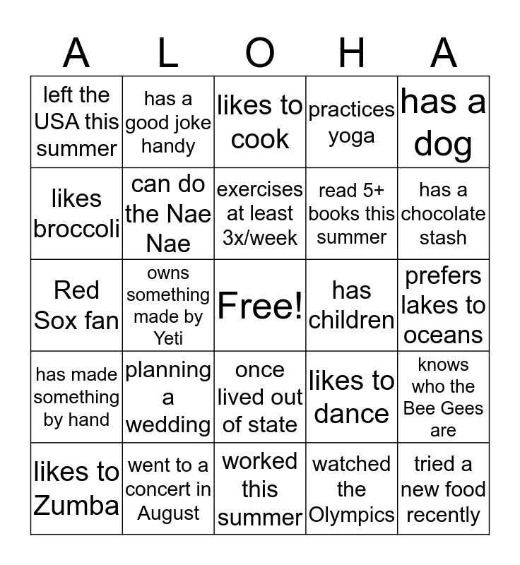 This bingo card has a free space and 24 words: planning a wedding, went to a concert in August, exercises at least 3x/week, likes to Zumba, has a dog, left the USA this summer, likes broccoli, has a good joke handy, has children, once lived out of state, read 5+ books this summer, Red Sox fan, likes to dance, knows who the Bee Gees are, can do the Nae Nae, watched the Olympics, prefers lakes to oceans, likes to cook, has a chocolate stash, owns something made by Yeti, tried a new food recently, has made something by hand, practices yoga and worked this summer.