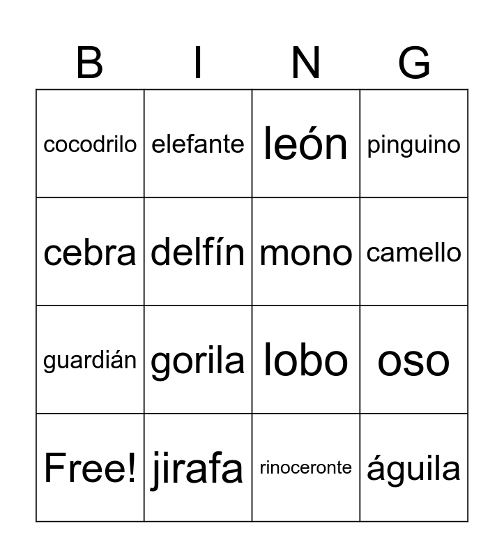 This bingo card has 23 words: águila, búhi, camello, canguro, cebra, cocodrilo, delfín, elefante, Free!, foca, gorila, guardián, guardiana, hipopótamo, jirafa, koala, león, lobo, mono, oso, pinguino, rinoceronte and tigre.