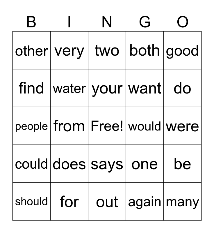 This bingo card has a free space and 24 words: does, for, your, should, good, other, find, very, would, says, want, people, one, be, water, again, were, two, do, from, many, could, both and out.