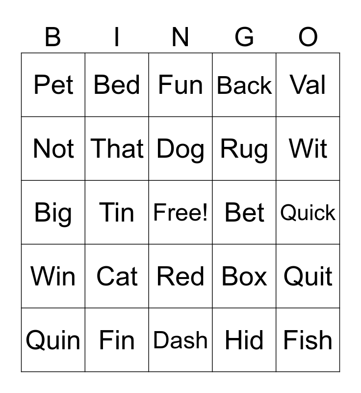This bingo card has a free space and 24 words: Cat, Fin, Dog, Quin, Val, Pet, Not, Bed, Bet, Red, Rug, Big, Box, Quit, That, Hid, Quick, Fun, Wit, Tin, Fish, Win, Back and Dash.