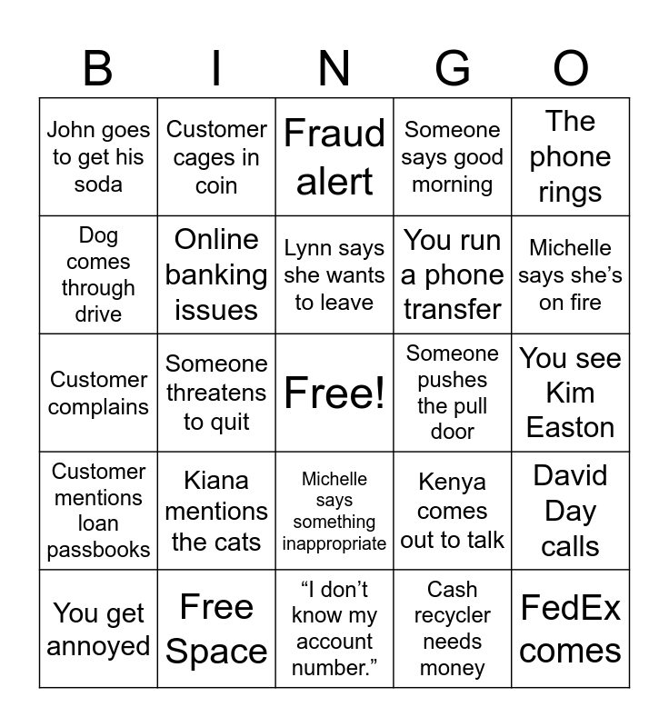 This bingo card has a free space and 40 words: Someone sings, Customer complains, Password reset, Online banking issues, Free Space, Michelle says something inappropriate, Lynn says she wants to leave, An officer door closes, The phone rings, Customer mentions loan passbooks, Someone threatens to quit, Someone says good morning, FedEx comes, You see Kim Easton, Someone pushes the pull door, Kiana mentions the cats, You see Jane, John goes to get his soda, Steve Sronce comes in, Fraud alert, David Day calls, Cash recycler needs money, You run a phone transfer, Dog comes through drive, Customer asks for John, Customer takes candy, Customer wants a print out, You misplace your pen, Customer asks for their balance, DSB pen gets taken, “Let me send you to one of the girls in the back” gets said by Lora., You get annoyed, Kathy sends an email, Kenya comes out to talk, Michelle says she’s on fire, “I don’t know my account number.”, You process a money order/cashiers check, Someone asks about CD rates, Customer cages in coin and Someone rolls their eyes.