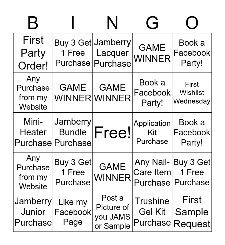 This bingo card has a free space and 24 words: Buy 3 Get 1 Free Purchase, Like my Facebook Page, GAME WINNER, Jamberry Junior Purchase, Book a Facebook Party!, First Party Order!, Any Purchase from my Website, Buy 3 Get 1 Free Purchase, Application Kit Purchase, GAME WINNER, Book a Facebook Party!, Mini-Heater Purchase, Any Nail-Care Item Purchase, Buy 3 Get 1 Free Purchase, GAME WINNER, Trushine Gel Kit Purchase, Book a Facebook Party!, Jamberry Lacquer Purchase, First Wishlist Wednesday, Jamberry Bundle Purchase, First Sample Request, Any Purchase from my Website, GAME WINNER and Post a Picture of you JAMS or Sample.