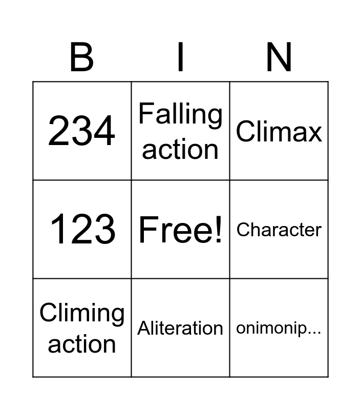 This bingo card has a free space and 11 words: Personification, Aliteration, onimonip..., Climing action, Falling action, Climax, Character, Setting, 123, 234 and 456.