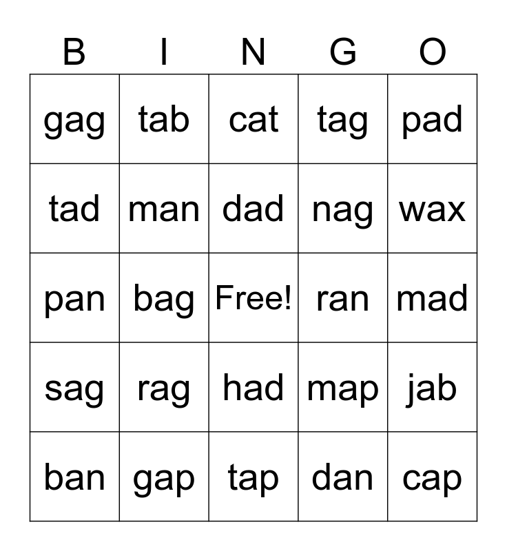 This bingo card has a free space and 63 words: cab, dab, gab, jab, lab, nab, tab, bad, dad, fad, had, lad, mad, pad, sad, tad, bag, gag, lag, nag, rag, sag, tag, wag, dam, ham, jam, pam, ram, sam, yam, fax, sax, tax, wax, ban, can, dan, fan, man, pan, ran, tan, van, cap, gap, lap, map, nap, rap, sap, tap, yap, zap, bat, cat, fat, hat, mat, pat, rat, sat and vat.