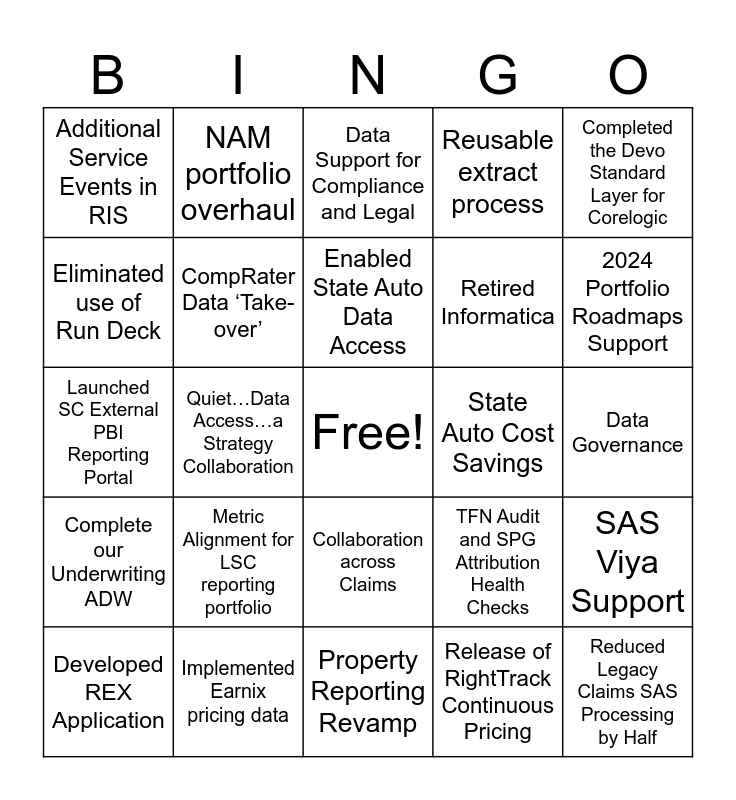 This bingo card has a free space and 58 words: PL Product Devo Modernization, Implemented Earnix pricing data, Complete WC Profitability Redesign, Complete our Underwriting ADW, Release of RightTrack Continuous Pricing, Developed Usage Query, CompRater Data ‘Take-over’, Choice AMS Application Launch, Retired Informatica, Call Transcription Data, Reusable extract process, DRC Segmentation Strategy Execution, TruStage Data Share Launch, Completed our North Star tagging refactoring work, Rollout of OneExperience for digital sales, Additional Service Events in RIS, Reduced Legacy Claims SAS Processing by Half, Completed the Devo Standard Layer for Corelogic, Completed Vaulting of Navigator Data, Enabled State Auto Data Access, State Auto Cost Savings, Data Support for Compliance and Legal, Developed REX Application, SAS Viya Support, Capacity Measurement, Data Governance, Data Product One-Pagers Creation, Data Dispatch Click Rate Increase, 2024 Portfolio Roadmaps Support, Deployed Graph, PBI Workspace Segmentation, Tableau Retirement, Message-Based Provisioning, IDMC POC/Extended POC, Brandenburg User Experience Improvements, Transparency into Total Cost of Ownership, Reset the P2D for Progressive Outcomes, Quiet…Data Access…a Strategy Collaboration, Launched SC External PBI Reporting Portal, Retired Legacy Bursting Process, Metric Alignment for LSC reporting portfolio, myPartner Performance, TFN Audit and SPG Attribution Health Checks, Innovation Week, Implemented Code Review Process, Documentation, Claims Simplification, Collaboration across Claims, Property Reporting Revamp, Availability Report Launch, CSC Reporting Overhaul, Service Metric Alignment, Fraud & Compliance Reporting Hubs, Operations Reporting Optimization, NAM portfolio overhaul, Territory Insights & Action portal, Eliminated use of Run Deck and Launched the State Auto ADP.