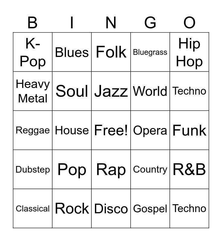 This bingo card has a free space and 24 words: Pop, Rock, Jazz, Classical, Hip Hop, K-Pop, Heavy Metal, Blues, Opera, Rap, World, Reggae, Country, R&B, Soul, Gospel, Funk, Folk, Techno, House, Techno, Dubstep, Bluegrass and Disco.
