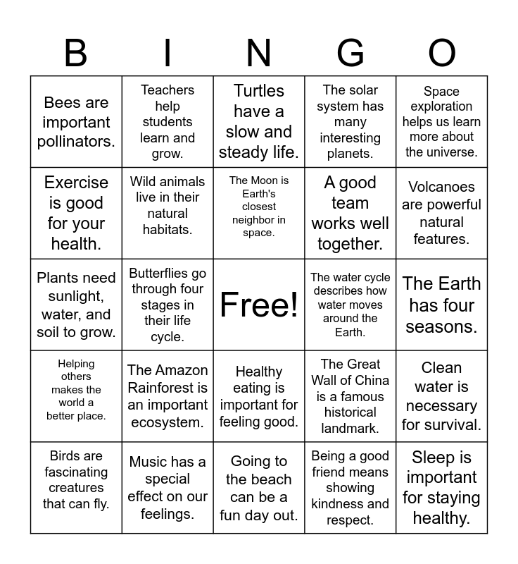 This bingo card has a free space and 30 words: Music has a special effect on our feelings., Reading books is important for learning., Butterflies go through four stages in their life cycle., School is a place to learn and grow., Bees are important pollinators., Turtles have a slow and steady life., Wild animals live in their natural habitats., Healthy eating is important for feeling good., The water cycle describes how water moves around the Earth., Going to the beach can be a fun day out., The Earth has four seasons., Sleep is important for staying healthy., Being a good friend means showing kindness and respect., Recycling helps protect the environment., Volcanoes are powerful natural features., There are different types of clouds in the sky., The Great Wall of China is a famous historical landmark., Helping others makes the world a better place., The Amazon Rainforest is an important ecosystem., Space exploration helps us learn more about the universe., Plants need sunlight, water, and soil to grow., Sunscreen protects our skin from harmful sun rays., Teachers help students learn and grow., A good team works well together., Exercise is good for your health., The solar system has many interesting planets., Clean water is necessary for survival., Birds are fascinating creatures that can fly., The Moon is Earth's closest neighbor in space. and Recycling paper helps save trees..