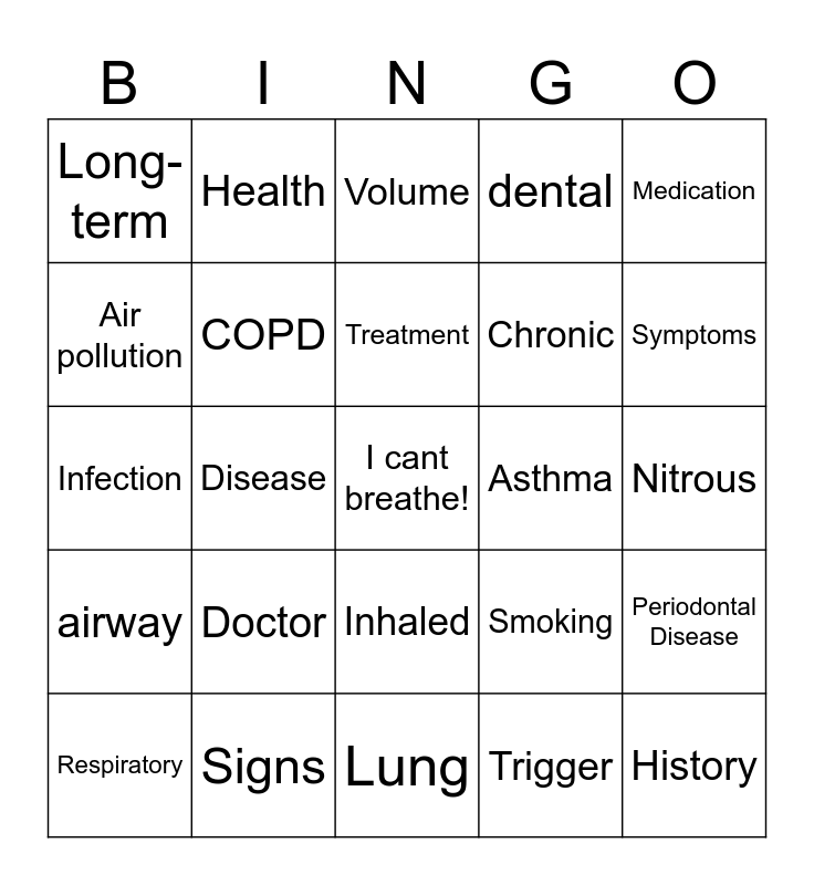 This bingo card has a free space and 29 words: Respiratory, Mucous, Disease, Disability, Long-term, Volume, COPD, Doctor, Asthma, Signs, Nitrous, History, Lung, Trigger, Symptoms, Flu, Inhaled, airway, Medication, Infection, Smoking, Fibrosis, Chronic, Air pollution, dental, Health, Periodontal Disease, Treatment and Pulmonary.