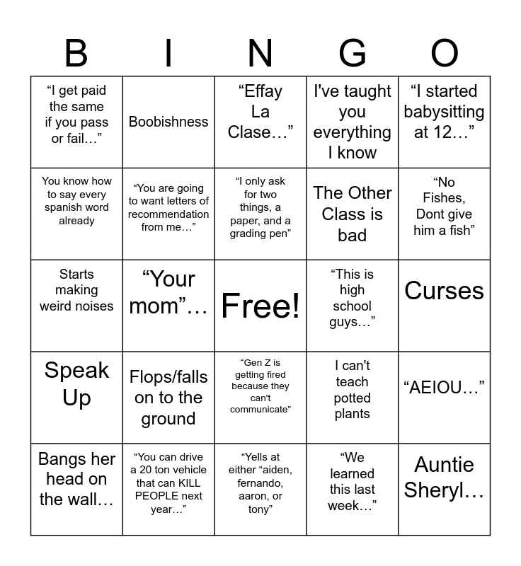 This bingo card has a free space and 29 words: In my 31 years of teaching…”, “You can drive a 20 ton vehicle that can KILL PEOPLE next year…”, “Effay La Clase…”, “Do your vocab…”, “I started babysitting at 12…”, “I get paid the same if you pass or fail…”, “You are going to want letters of recommendation from me…”, “I only ask for two things, a paper, and a grading pen”, “This is high school guys…”, “AEIOU…”, Bangs her head on the wall…, “Your mom”…, “We learned this last week…”, Auntie Sheryl…, Starts making weird noises, “Backhand, Forehand”, “Yells at either “aiden, fernando, aaron, or tony”, I can't teach potted plants, “No Fishes, Dont give him a fish”, Speak Up, Flops/falls on to the ground, USE YOUR THINKING TIME, The Other Class is bad, Curses, You know how to say every spanish word already, Boobishness, “Gen Z is getting fired because they can't communicate”, I've taught you everything I know and Bananas or Bananans.