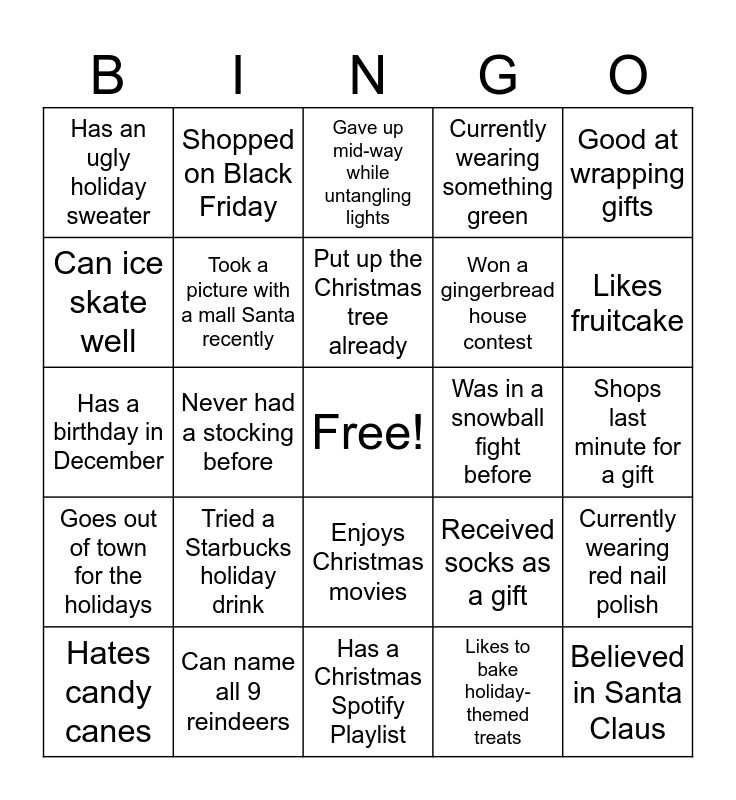 This bingo card has a free space and 24 words: Tried a Starbucks holiday drink, Can name all 9 reindeers, Put up the Christmas tree already, Hates candy canes, Good at wrapping gifts, Has an ugly holiday sweater, Can ice skate well, Shopped on Black Friday, Was in a snowball fight before, Enjoys Christmas movies, Won a gingerbread house contest, Has a birthday in December, Received socks as a gift, Currently wearing red nail polish, Took a picture with a mall Santa recently, Likes to bake holiday-themed treats, Shops last minute for a gift, Gave up mid-way while untangling lights, Likes fruitcake, Never had a stocking before, Believed in Santa Claus, Goes out of town for the holidays, Currently wearing something green and Has a Christmas Spotify Playlist.