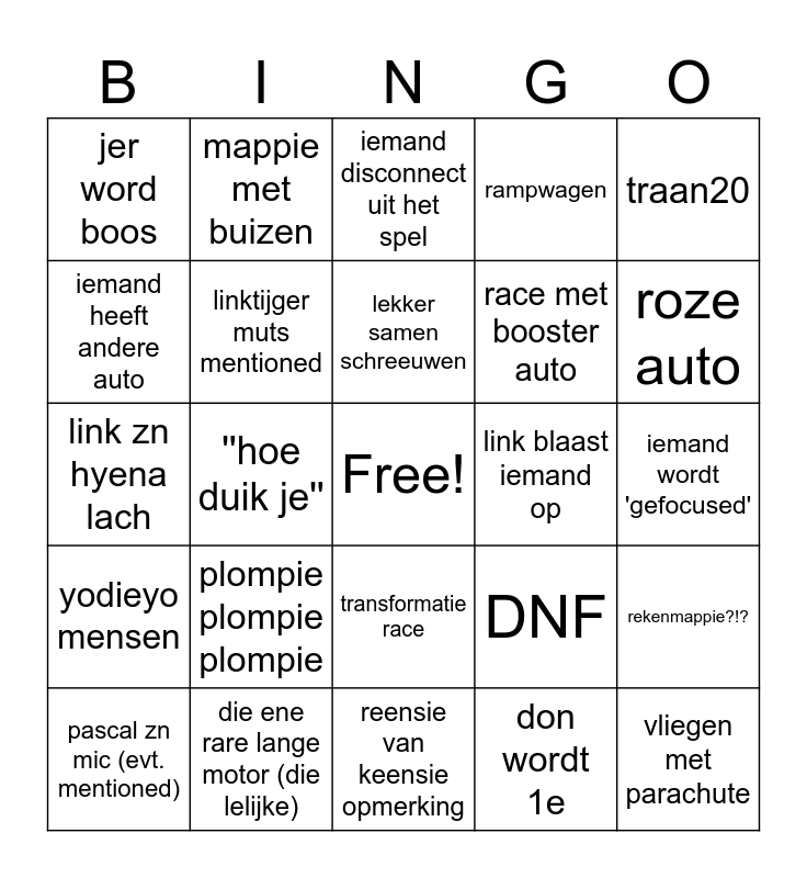 This bingo card has a free space and 24 words: plompie plompie plompie, die ene rare lange motor (die lelijke), lekker samen schreeuwen, pascal zn mic (evt. mentioned), traan20, jer word boos, iemand heeft andere auto, mappie met buizen, link blaast iemand op, transformatie race, race met booster auto, link zn hyena lach, DNF, rekenmappie?!?, linktijger muts mentioned, don wordt 1e, iemand wordt 'gefocused', iemand disconnect uit het spel, roze auto, ''hoe duik je'', vliegen met parachute, yodieyo mensen, rampwagen and reensie van keensie opmerking.