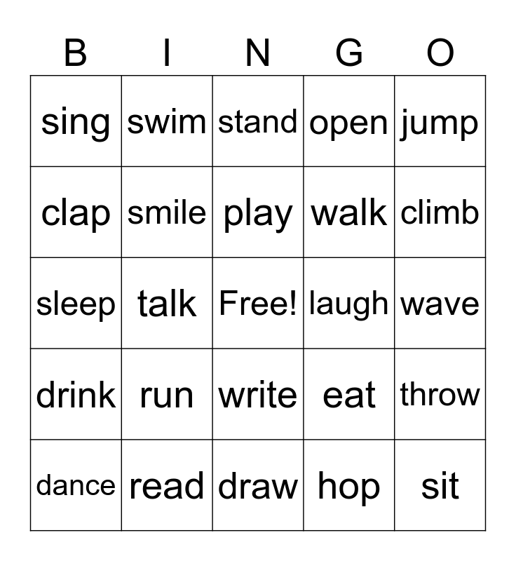 This bingo card has a free space and 24 words: run, read, play, dance, jump, sing, clap, swim, laugh, write, walk, sleep, eat, throw, smile, hop, wave, stand, climb, talk, sit, drink, open and draw.