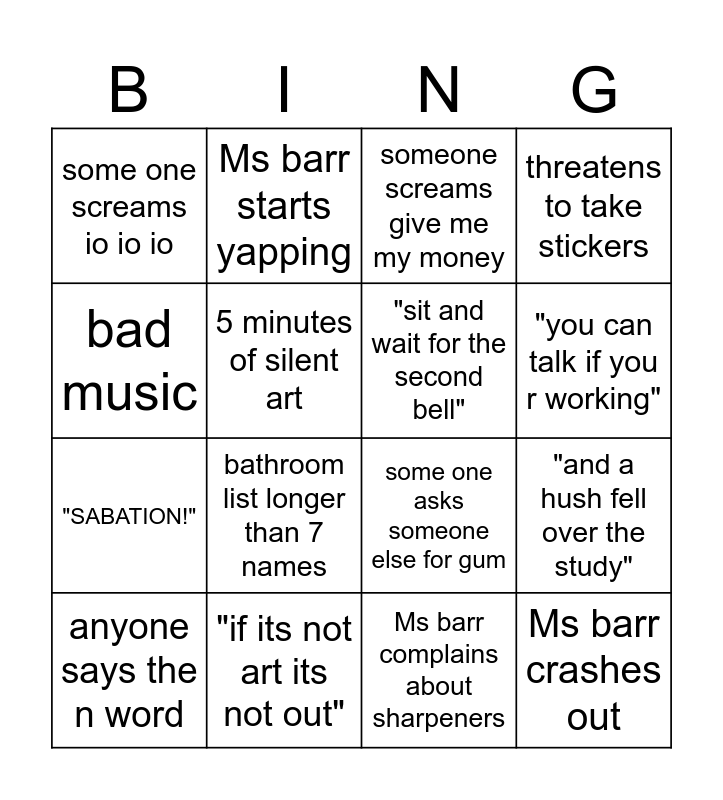 This bingo card has 16 words: "if its not art its not out", "and a hush fell over the study", someone screams give me my money, some one screams io io io, "SABATION!", Ms barr starts yapping, some one asks someone else for gum, Ms barr complains about sharpeners, bad music, 5 minutes of silent art, anyone says the n word, threatens to take stickers, bathroom list longer than 7 names, "you can talk if you r working", "sit and wait for the second bell" and Ms barr crashes out.