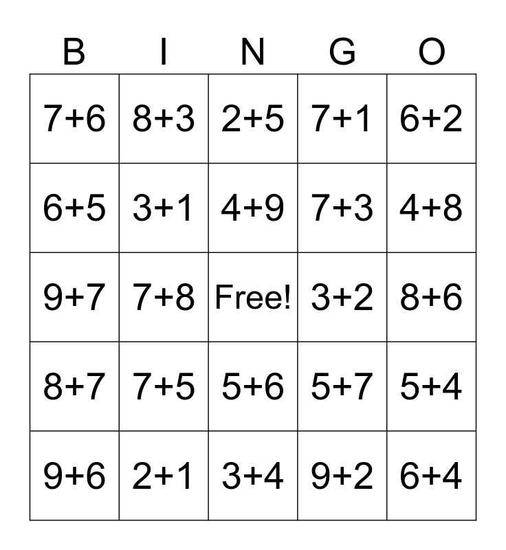 This bingo card has a free space and 29 words: 9+6, 4+1, 7+8, 9+1, 7+6, 2+5, 3+1, 7+5, 3+2, 2+1, 8+6, 6+4, 3+4, 9+2, 4+8, 3+5, 5+6, 8+7, 6+2, 9+7, 5+7, 1+6, 7+3, 6+5, 7+1, 8+3, 5+4, 4+9 and 5+5.