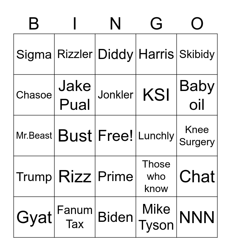 This bingo card has a free space and 24 words: Rizz, Fanum Tax, Jonkler, Gyat, Skibidy, Sigma, Chasoe, Rizzler, Lunchly, Prime, KSI, Mr.Beast, Those who know, Chat, Jake Pual, Mike Tyson, Knee Surgery, Diddy, Baby oil, Bust, NNN, Trump, Harris and Biden.
