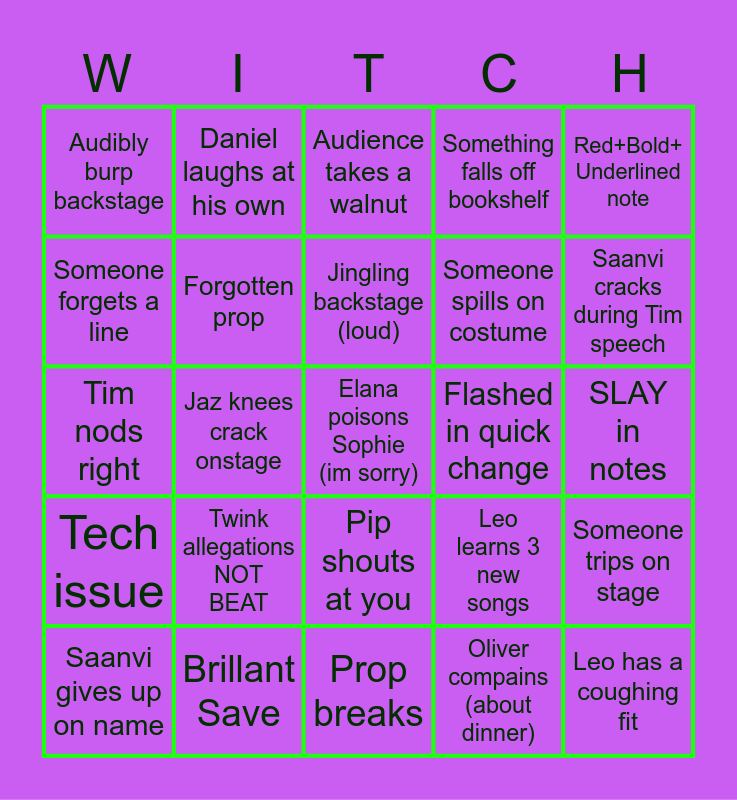 This bingo card has a free space and 24 words: Twink allegations NOT BEAT, Brillant Save, Jingling backstage (loud), Saanvi gives up on name, Red+Bold+ Underlined note, Audibly burp backstage, Someone forgets a line, Daniel laughs at his own, Flashed in quick change, Pip shouts at you, Someone spills on costume, Tim nods right, Leo learns 3 new songs, Someone trips on stage, Forgotten prop, Oliver compains (about dinner), SLAY in notes, Audience takes a walnut, Saanvi cracks during Tim speech, Jaz knees crack onstage, Leo has a coughing fit, Tech issue, Something falls off bookshelf and Prop breaks.