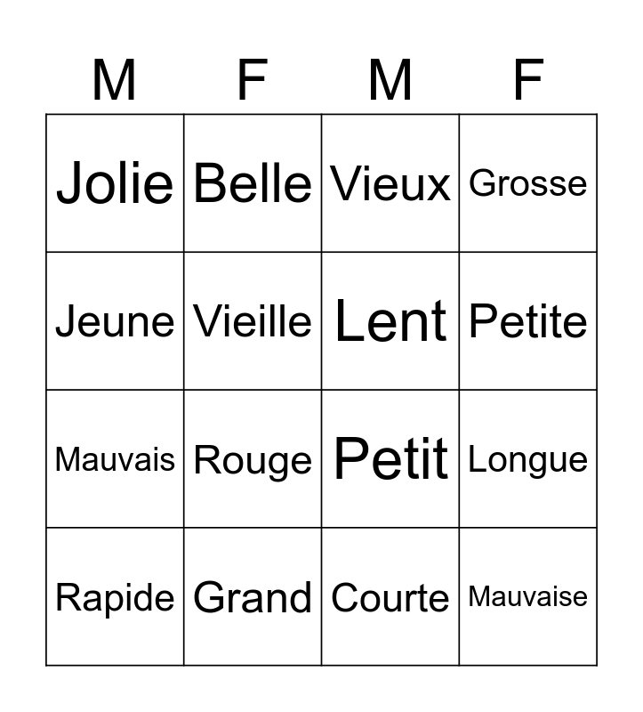 This bingo card has 16 words: Grand, Longue, Vieux, Jolie, Mauvais, Belle, Petit, Courte, Jeune, Vieille, Rapide, Grosse, Rouge, Petite, Lent and Mauvaise.
