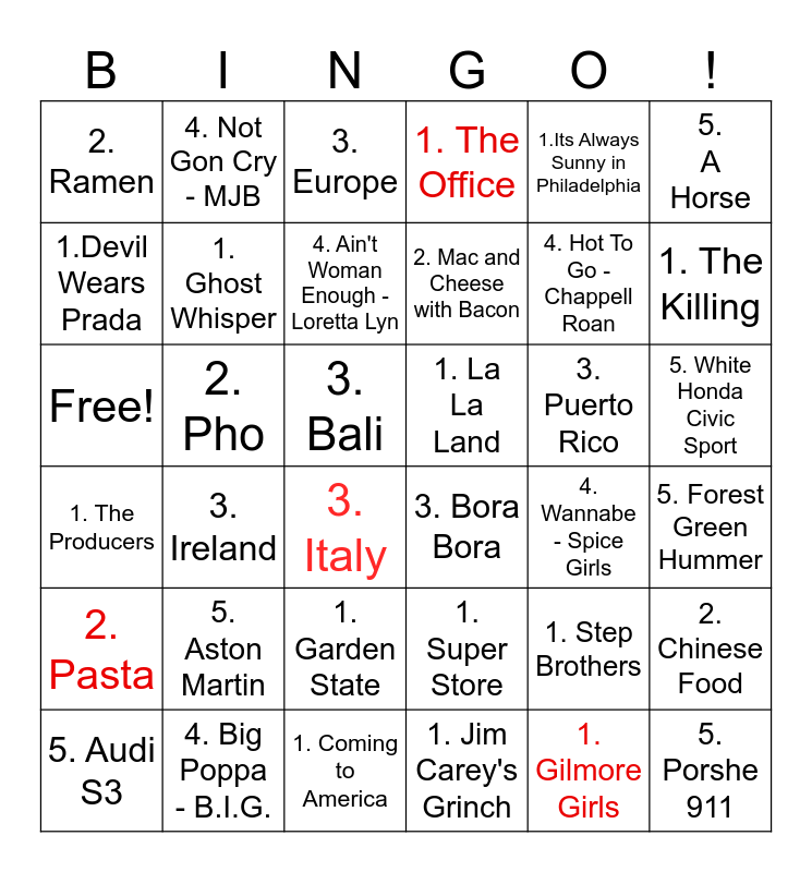 This bingo card has 36 words: 1. Super Store, 1. Garden State, 1. Jim Carey's Grinch, 1.Devil Wears Prada, 1. The Producers, 1. La La Land, 1. Ghost Whisper, 1. Coming to America, 1.Its Always Sunny in Philadelphia, 1. Step Brothers, 1. The Killing, 1. The Office, 2. Chinese Food, 2. Pho, 2. Mac and Cheese with Bacon, 2. Ramen, 2. Pasta, 3. Puerto Rico, Free!, 3. Europe, 3. Bali, 3. Ireland, 3. Bora Bora, 3. Italy, 4. Wannabe - Spice Girls, 4. Not Gon Cry - MJB, 4. Hot To Go - Chappell Roan, 4. Big Poppa - B.I.G., 4. Ain't Woman Enough - Loretta Lyn, 5. A Horse, 5. Porshe 911, 5. Audi S3, 5. Forest Green Hummer, 5. White Honda Civic Sport, 5. Aston Martin and 1. Gilmore Girls.