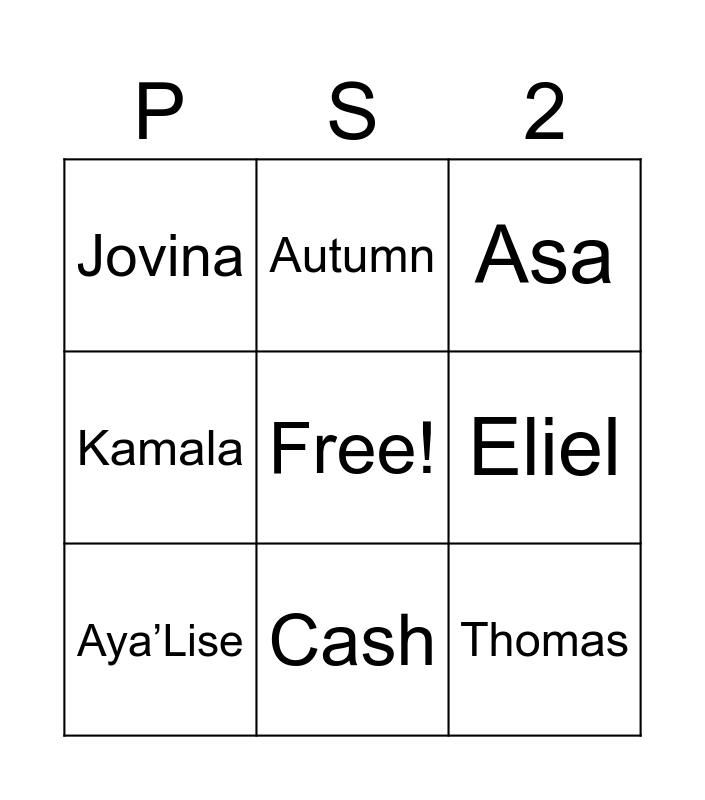 This bingo card has a free space and 8 words: Eliel, Asa, Autumn, Aya’Lise, Jovina, Thomas, Kamala and Cash.